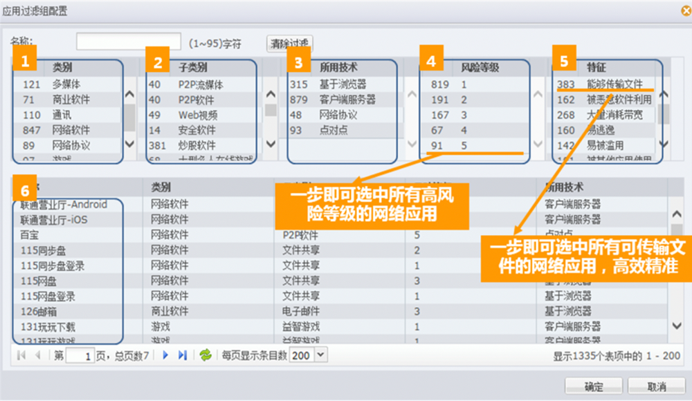 ●精准应用筛选。必一运动Bsports数码下一代防火墙给予了精细化的应用筛选机制。用户可根据应用名称、应用类别、应用子类别、风险级别、所用技术、应用特征等6大条件。精确筛选出感兴趣的应用类型,如具备文件传输功能的通讯软件,或存在已知漏洞、基于浏览器的WEB视频应用等等,从而实现精细化的应用管控。